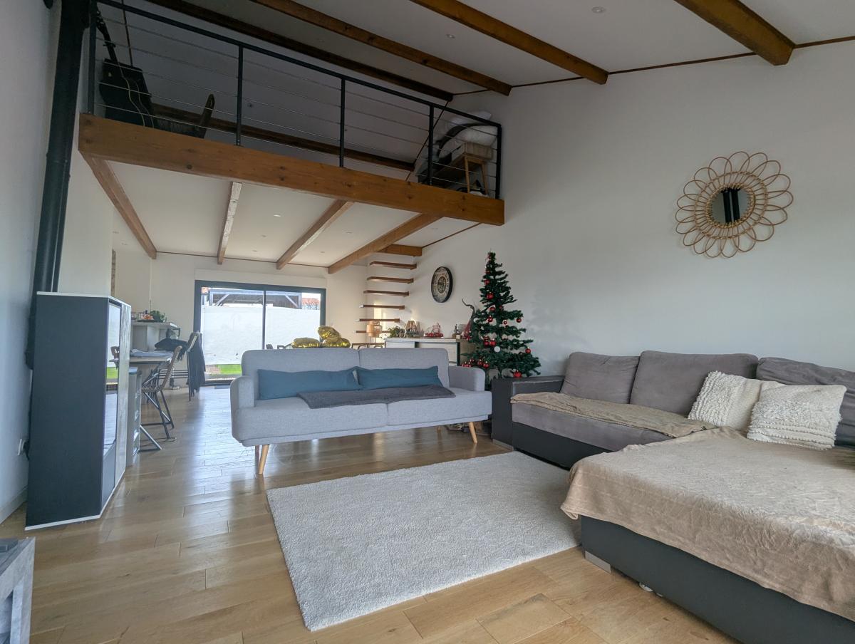 Une entrée, un salon séjour avec grande mezzanine, une cuisine ouverte aménagée et équipée, trois chambres, deux salle d'eau avec wc, un dressing, un bureau et un garage attenant.
